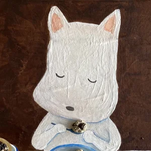 In this painting, what The White Dog is enjoying is "Churchill", a famous shaved ice in Costa Rica. The vivid pink syrup is called Kola syrup but is not related to Coke; For me, it's just the right amount of sweetness. I feel nostalgic eating it.