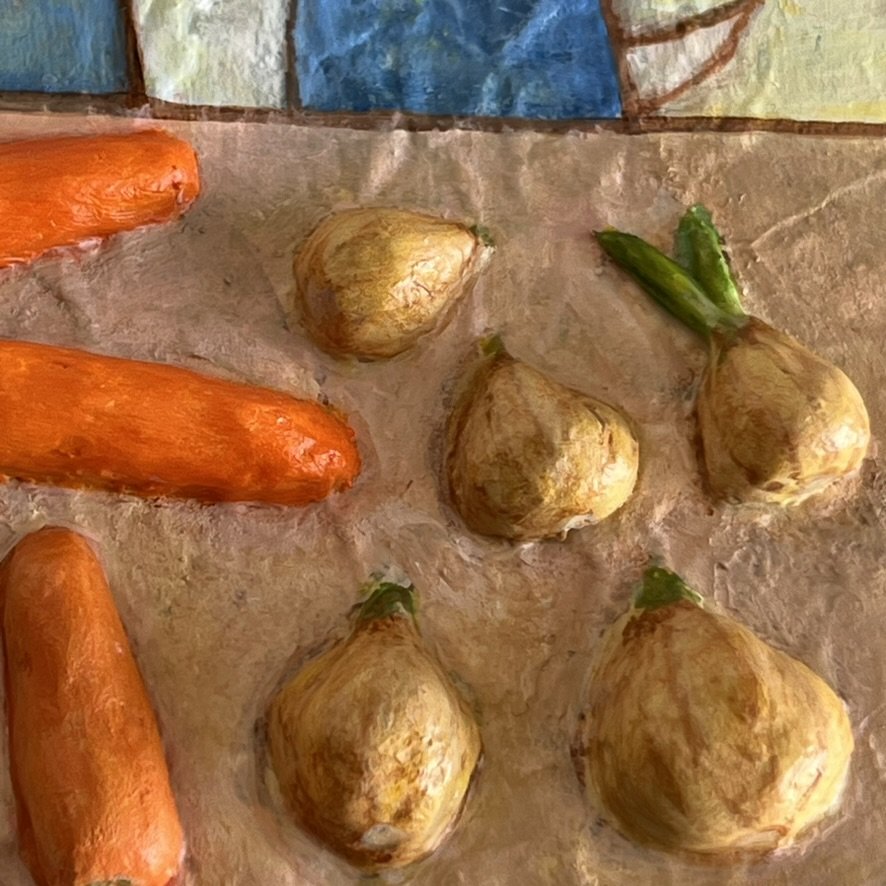 テーブルの上のごろごろ野菜。一見わくわくしそうな光景に見えるのですが、よく見ると芽が出ていたり、緑になっていたり😅、カサカサになっていたりします。そして白い犬たちは何やら真剣に考えている様子。