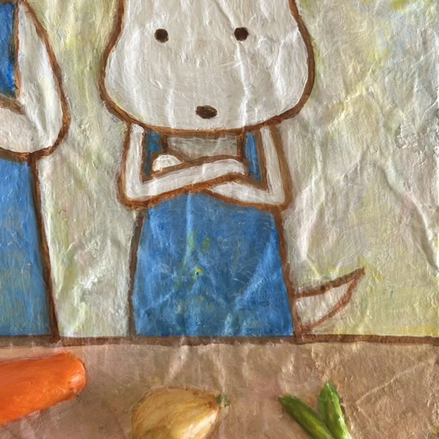You can see the table with so many veggies, which looks intriguing at first glance. But if you look closely, some start to sprout, and some are dried. And the facial expression of The White Dogs also seems like they're contemplating something.