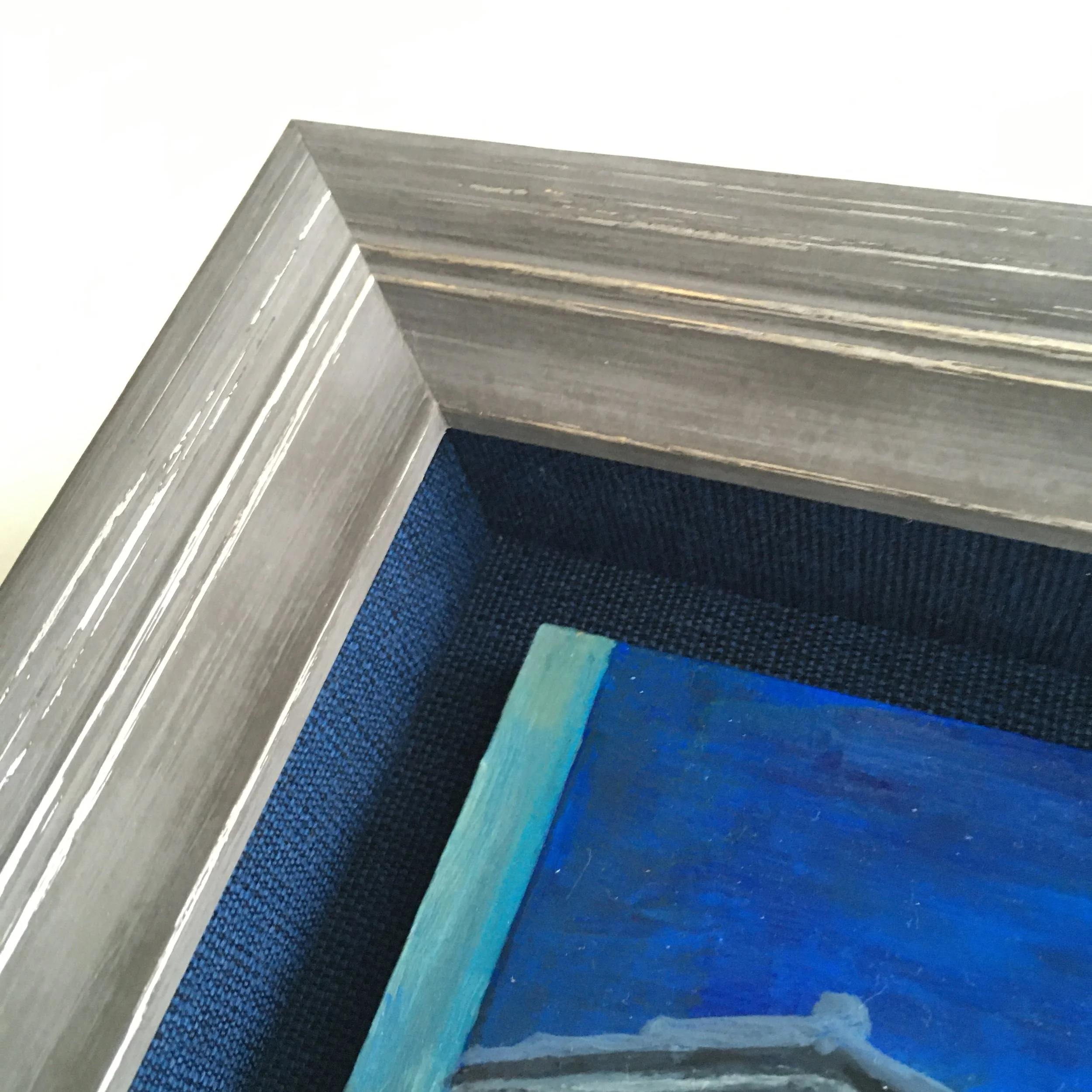 代理額装ひとつめ。路地の奥のひっそり佇む古い民家の合わせて深さのあるBOX額と濃いブルーの布地を選びました。今回お世話になったのはナビス画材さん。このあと2つ続きます。