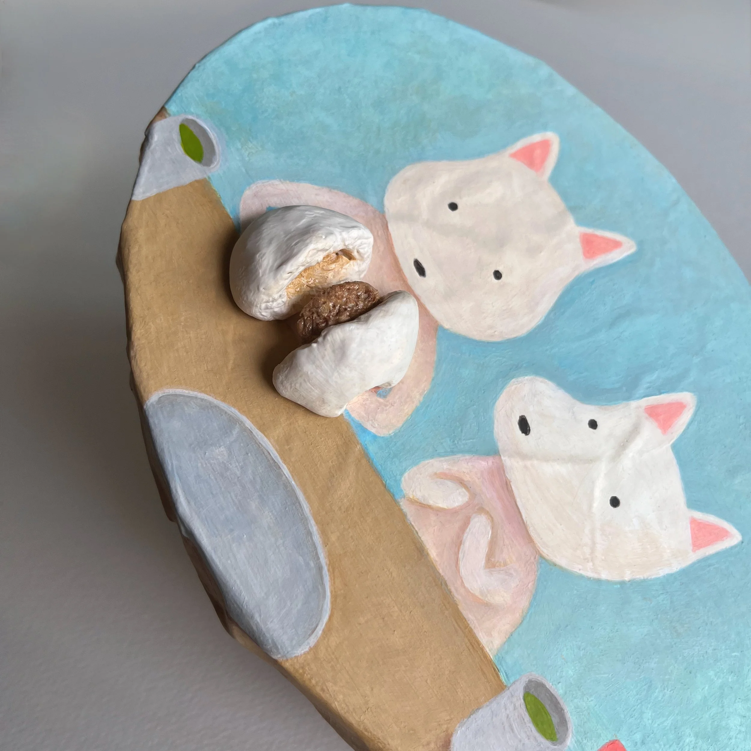 A warm steamed pork bun, shared nicely between two… or so they thought! It seems all the filling ended up on one side! We’ve all had moments like this.