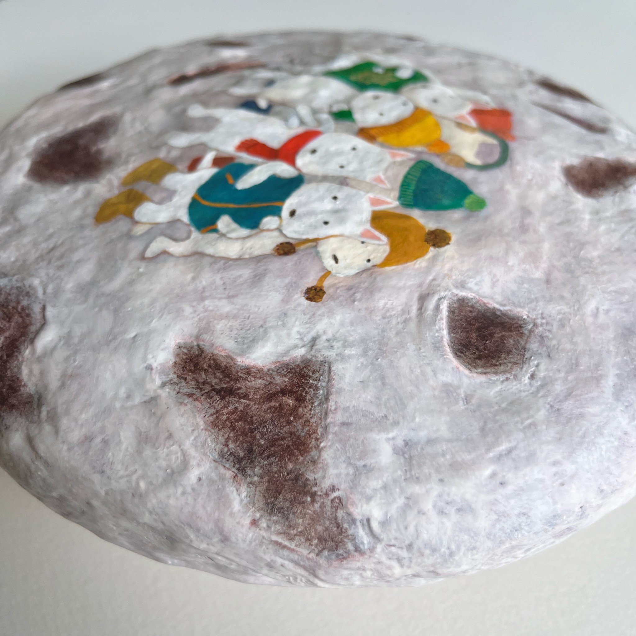 丸いキャンバスをやぶれ饅頭っぽく加工し、そこに「おしくらまんじゅう」の様子を描きました。まんじゅう on まんじゅう です。 😆