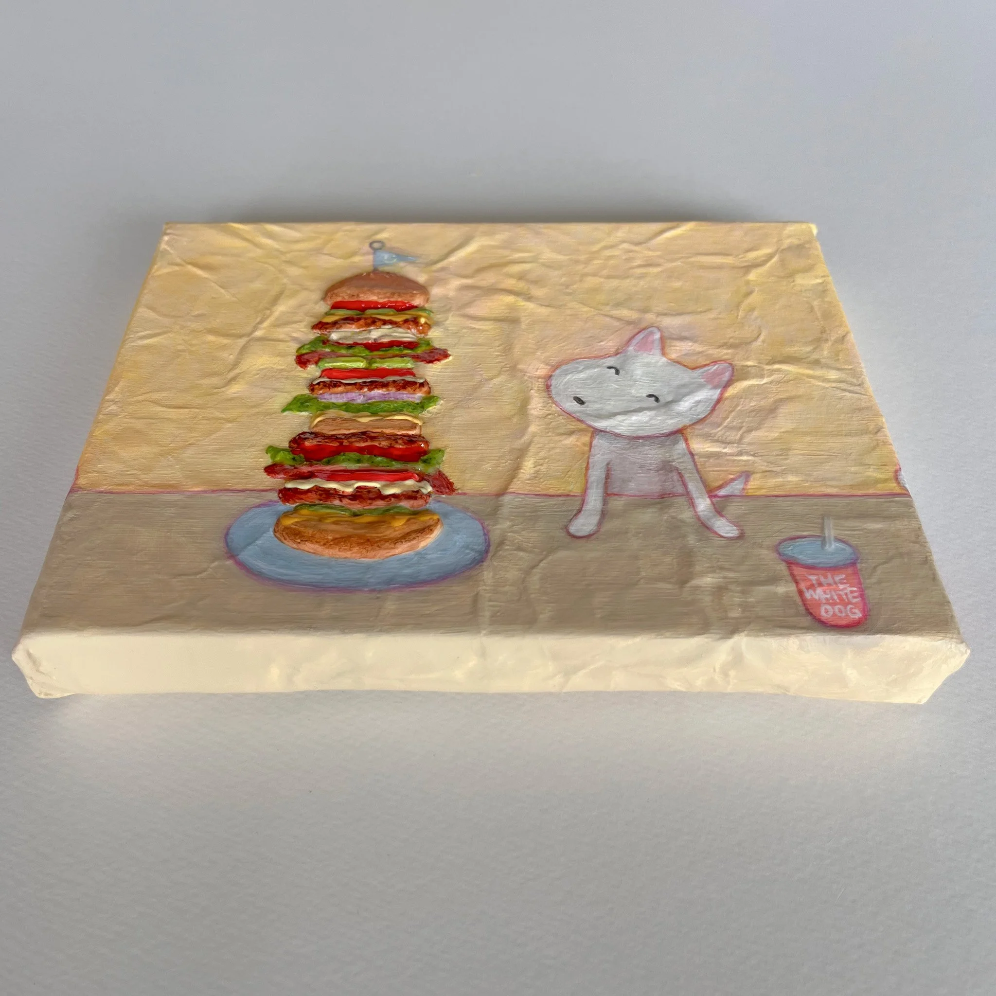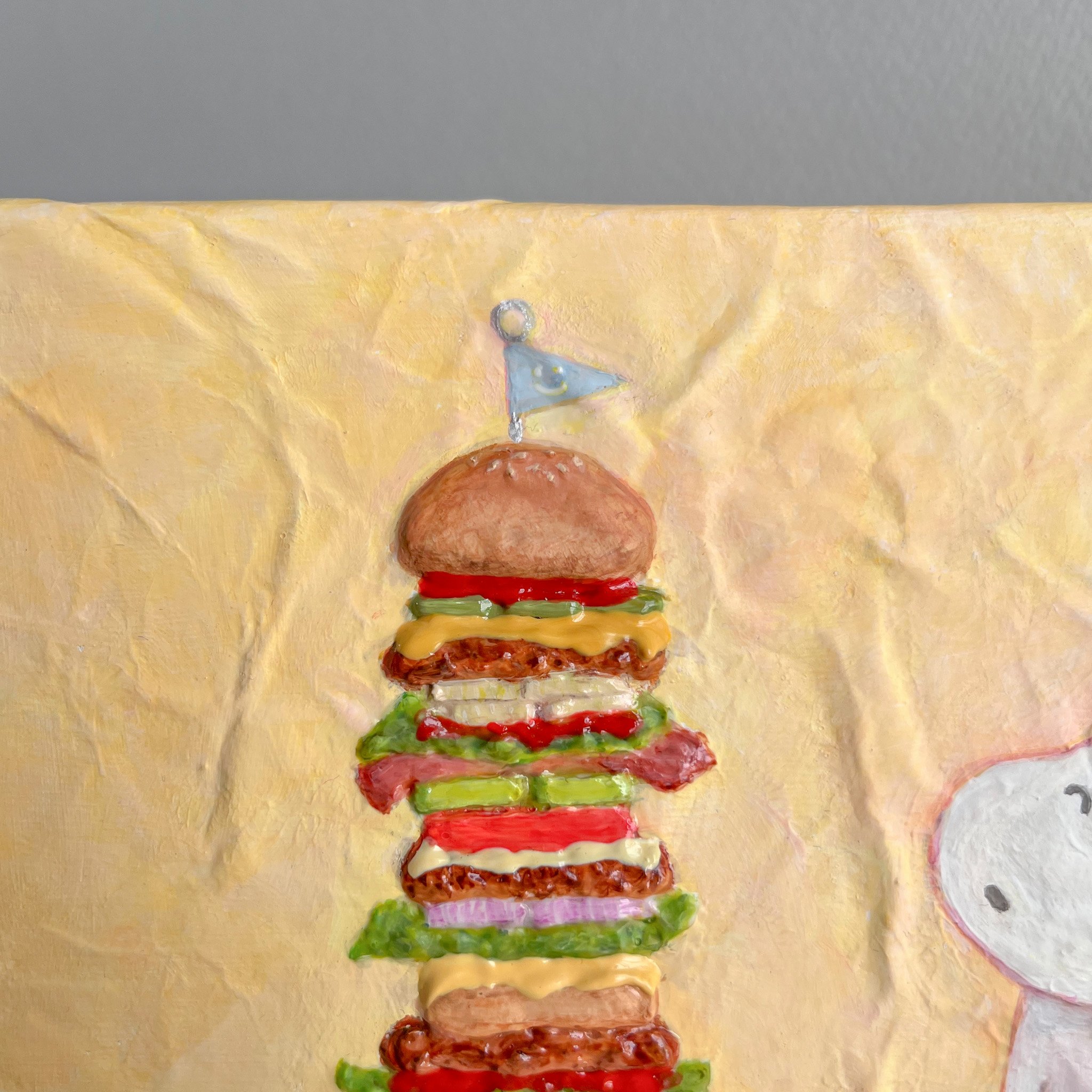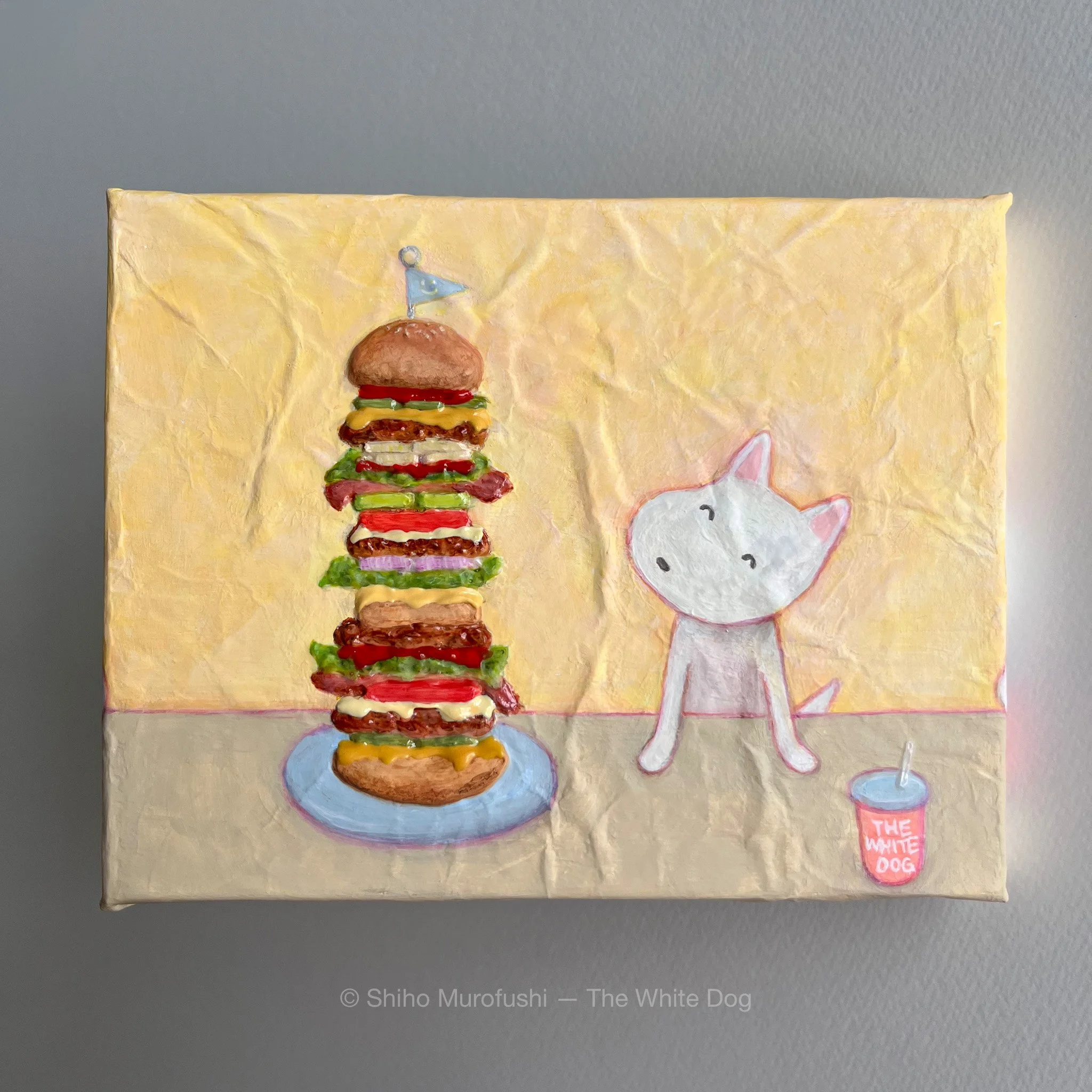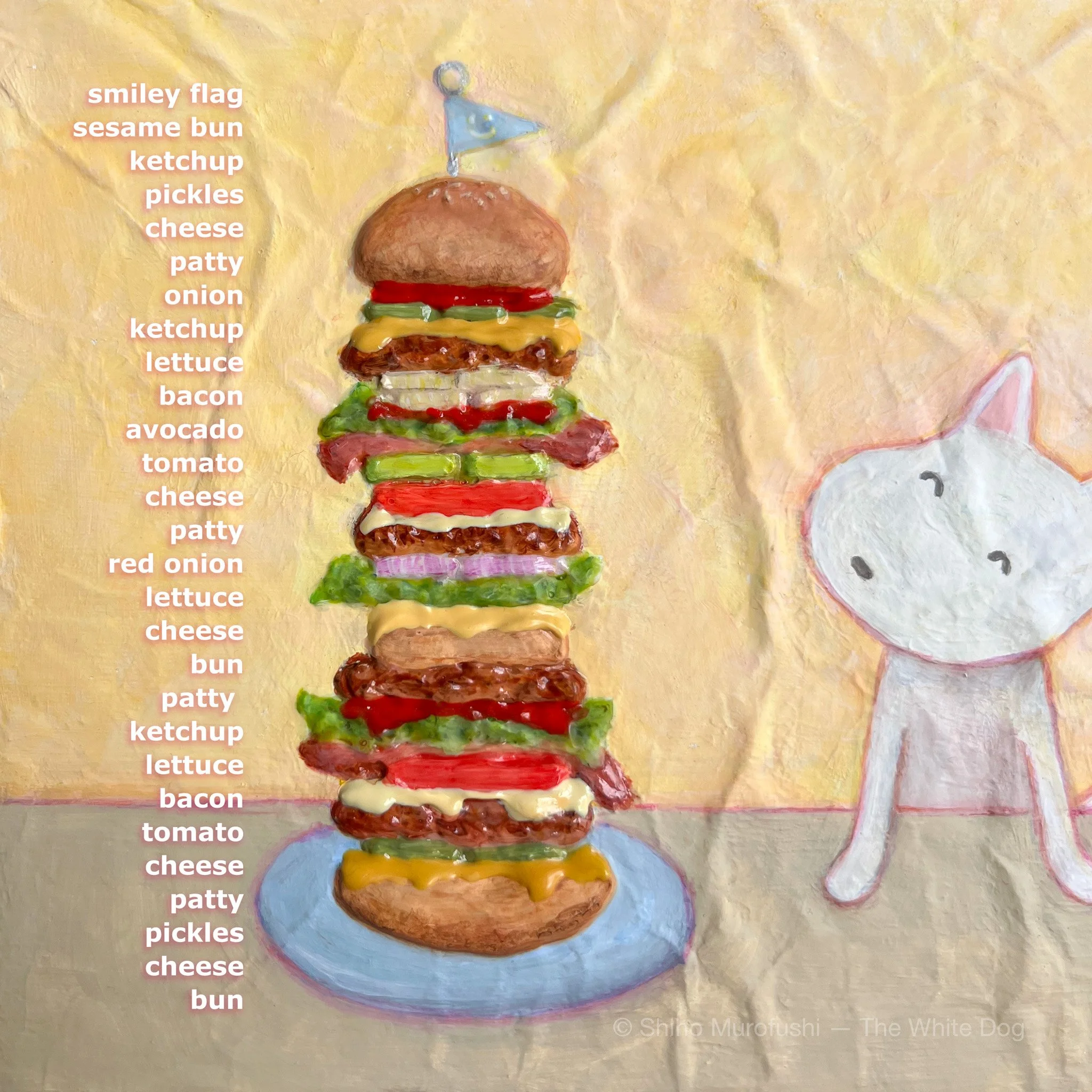 ニコちゃんフラッグ、ゴマつきバンズ、ケチャップ、ピクルス、チーズ、パテ、オニオン、ケチャップ、レタス、ベーコン、アボカド、トマト、チーズ、パテ、レッドオニオン、レタス、チーズ、バンズ、パテ、ケチャップ、レタス、ベーコン、トマト、チーズ、パテ、ピクルス、チーズ、バンズ